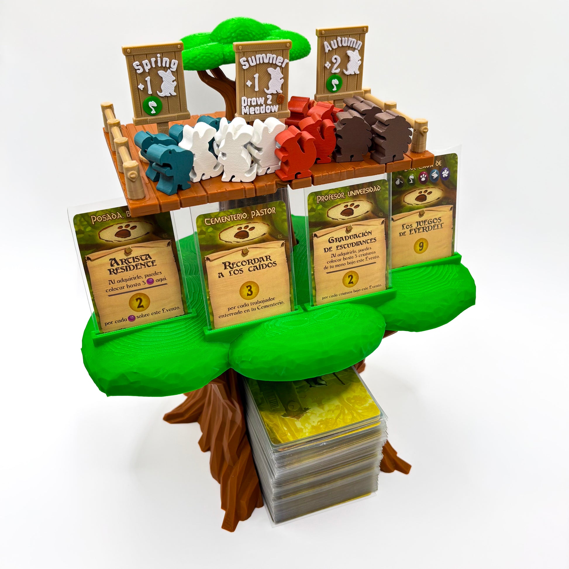 The upgraded Ever Tree becomes a beautiful centerpiece for your Everdell table while providing a stable structure to display objective cards clearly for all players.